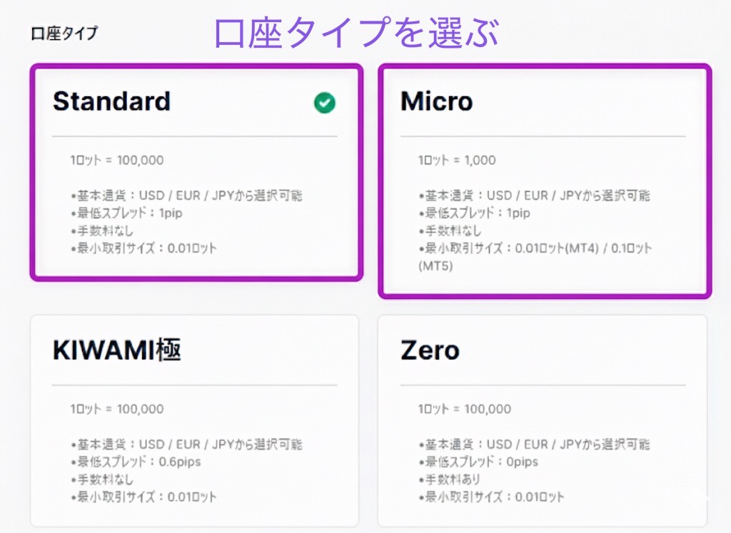 口座タイプの選択が重要 10万円チャレンジでボーナスを活用するなら、入金ボーナス対象の「スタンダード口座」または「マイクロ口座」を選んでください。