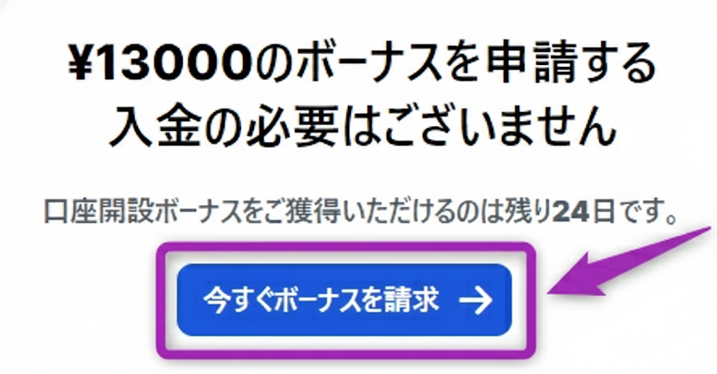 口座有効化が完了すると、マイページに「ボーナスを請求する」というボタンが表示されます。これをクリックするだけで、自動的に13,000円分のボーナスが口座に反映されます。