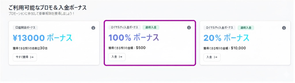 これらのボーナスを活用すれば、自己資金を大幅に増やして取引を始められます。