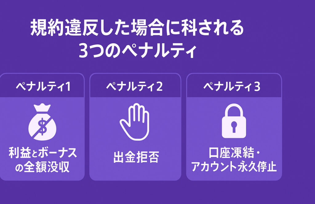 知らずに違反してしまうと、せっかく稼いだ利益が没収されたり、最悪の場合は口座が凍結されて二度とXMを使えなくなる可能性もあるんですね。
