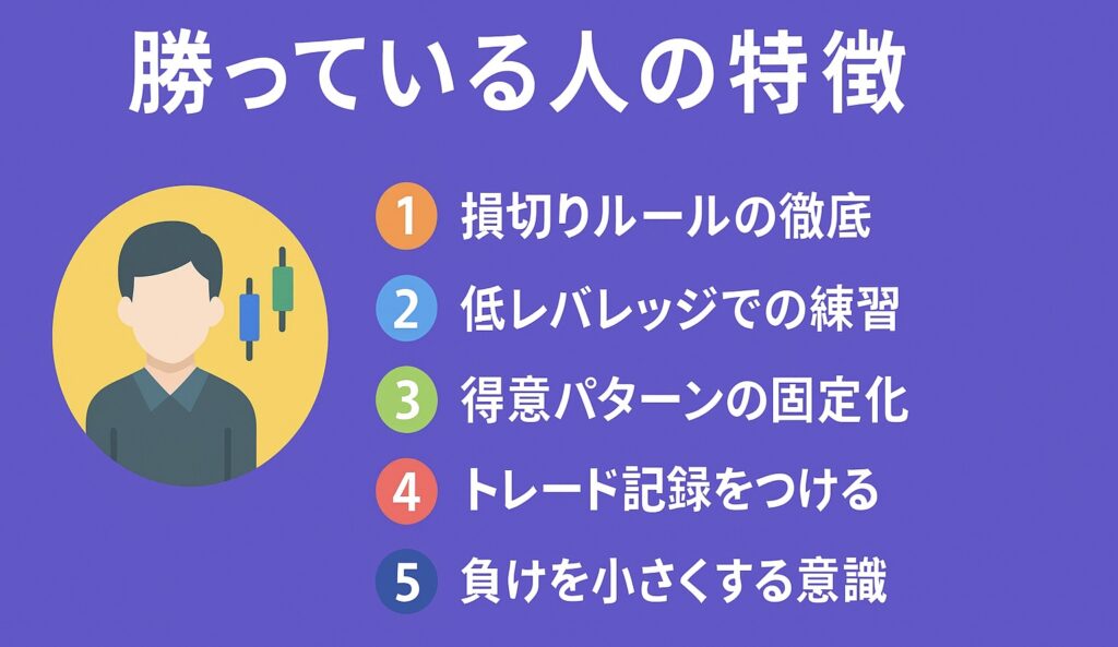 勝ち組に共通するのは、損切りの徹底、低レバレッジ、得意パターンへの集中、トレード記録、損小利大の意識という、誰でも実践できるシンプルなルールです。