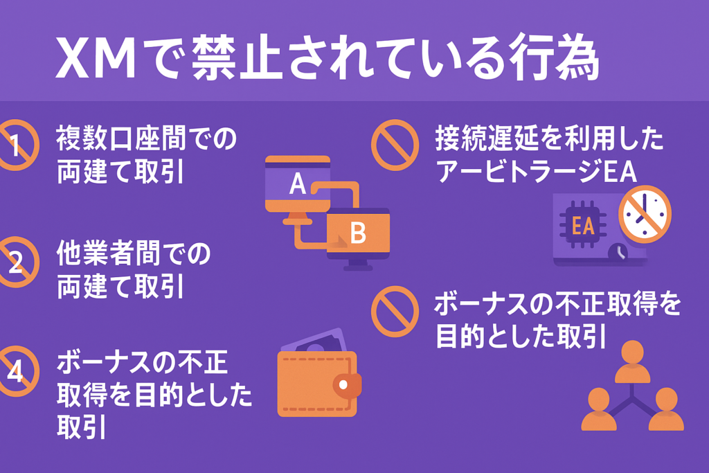 例えばXMで買いポジション、Exnessで同時に売りポジションを持つような運用は規約違反となり、口座凍結や利益没収のリスクがあります。