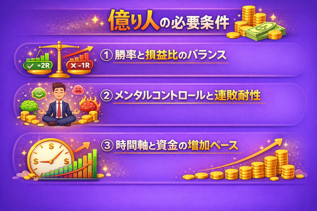 しかし、1億円に到達できるトレーダーは全体の1%未満とも言われており、適切な資金管理・メンタルコントロール・戦略的なトレード技術が不可欠です。