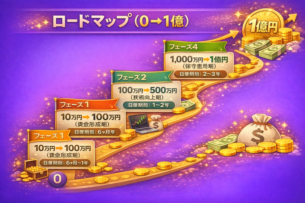 ここでは、元手10万円から1億円を目指す具体的なロードマップを、資金額ごとのフェーズに分けて解説します。