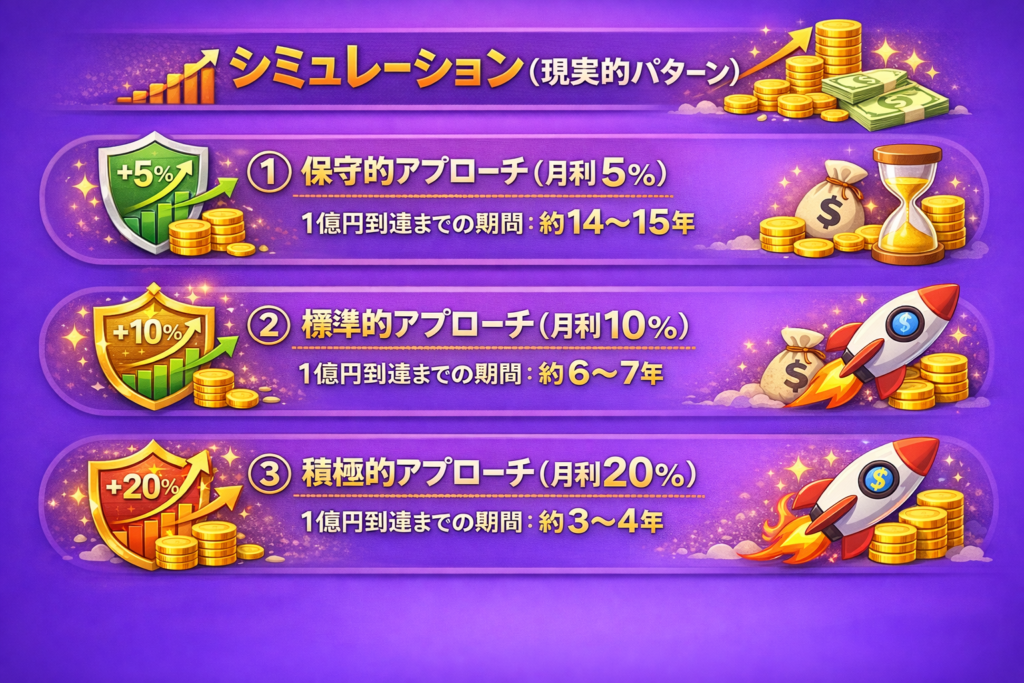 ここでは、元手10万円から1億円を目指す場合の3つのシナリオをシミュレーションします。それぞれリスクとリターンのバランスが異なるため、自分のスタイルに合ったパターンを参考にしてください。