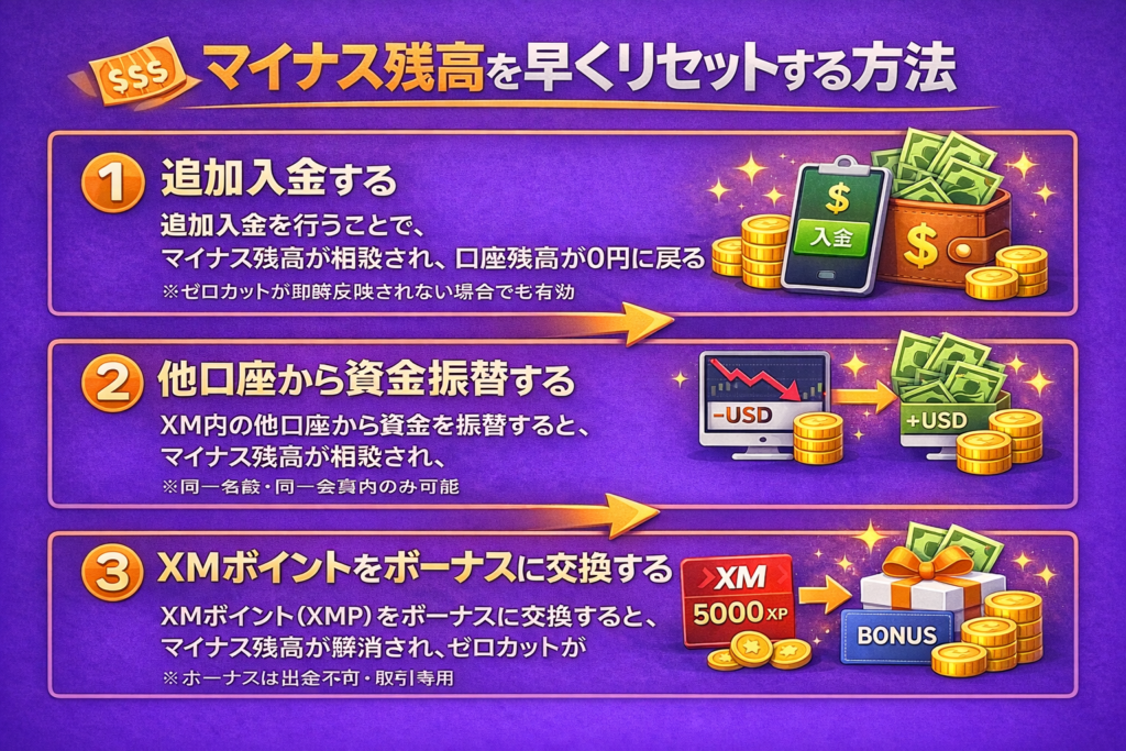 - マイナス残高を早くリセットしたい場合は、追加入金・資金振替・XMP交換で対応可能